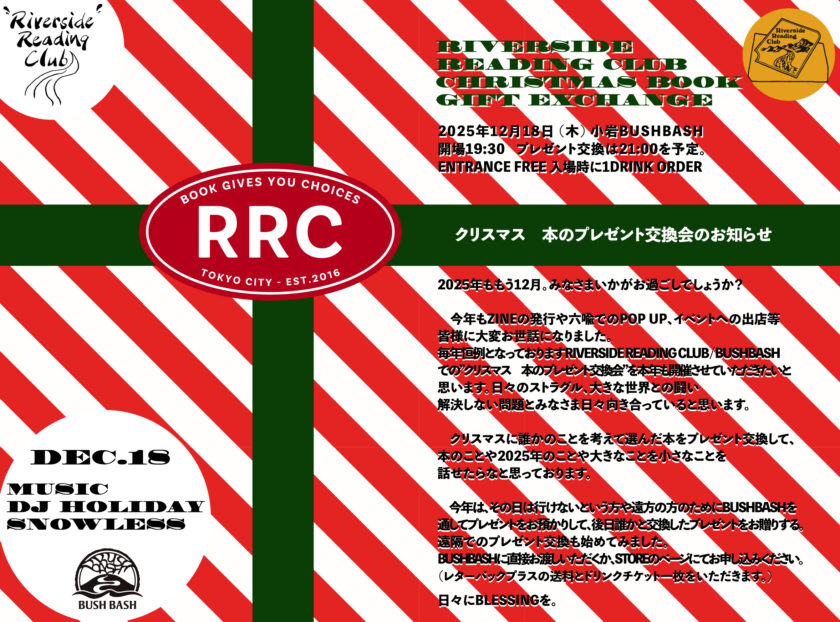 本のプレゼント交換を行います。参加希望の方は本をプレゼントしたいご持参ください MUSIC: DJ HOLIDAY SNOWLESS