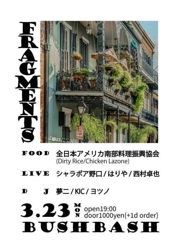 food : 全日本アメリカ南部料理振興協会 (Dirty Rice/Chicken Lazone) , live : シャラポア野口 / はりや / 西村卓也 , dj : 夢二 / KIC / ヨツノ